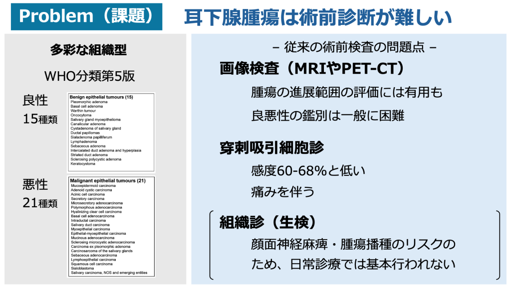 現実には、耳下腺腫瘍は組織型が多彩で、MRIや細胞診を用いても診断精度は高くない。約3割は診断がつかないまま手術に臨むことになり、患者のQOLを守るための判断が、外科医にとって大きな心理的負担となっている。